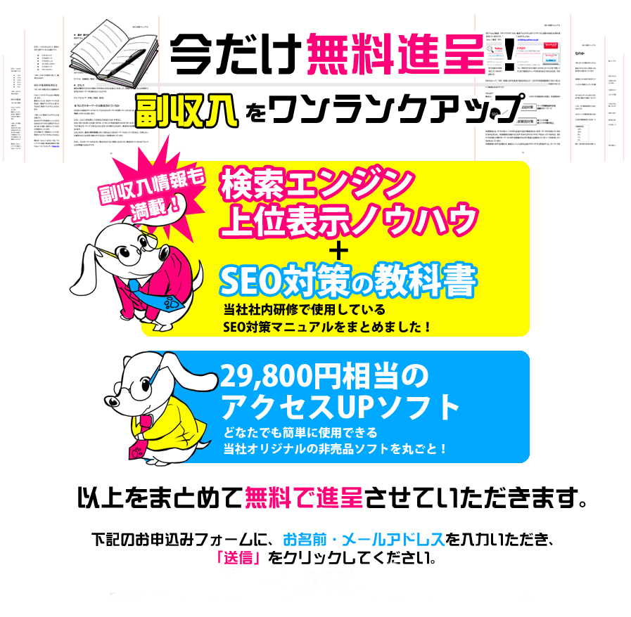 簡単アクセスアップツールと検索エンジンで上位表示するための教科書を無料で進呈します。
